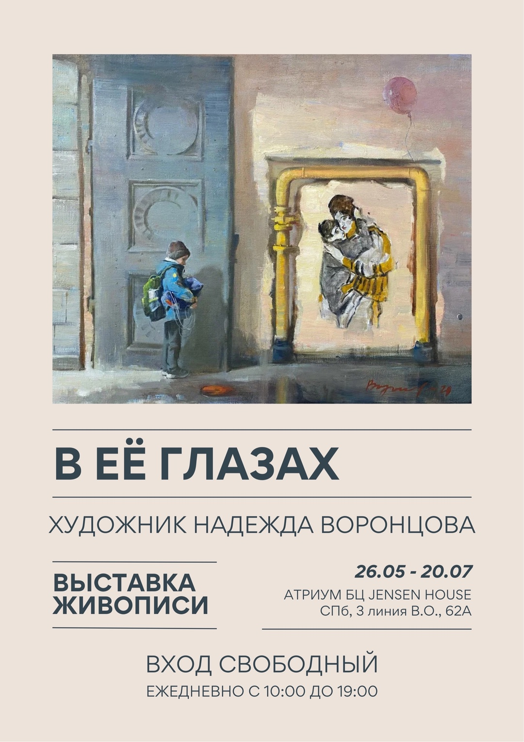 "Выставка «В её глазах» — это глубоко личный и эмоциональный взгляд художницы на мир, пропущенный через призму женского восприятия. Четырнадцать картин, объединённых темами материнства, детства и цветов, становятся отражением внутреннего состояния автора — её нежности, трепета, воспоминаний.